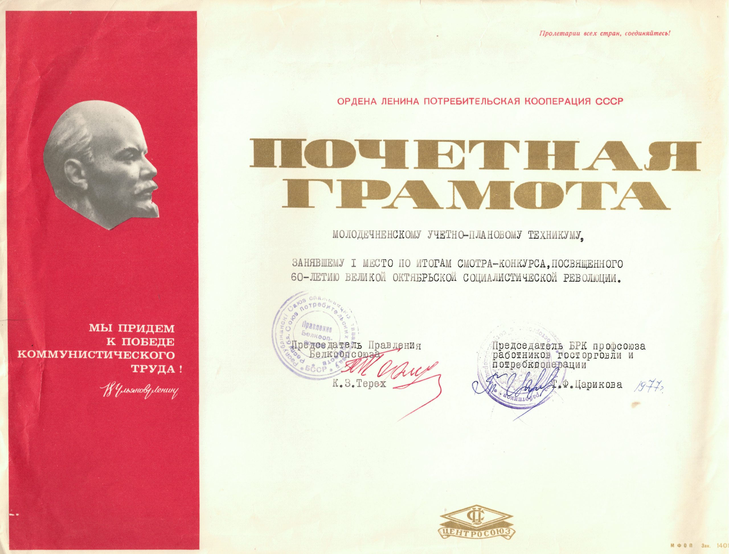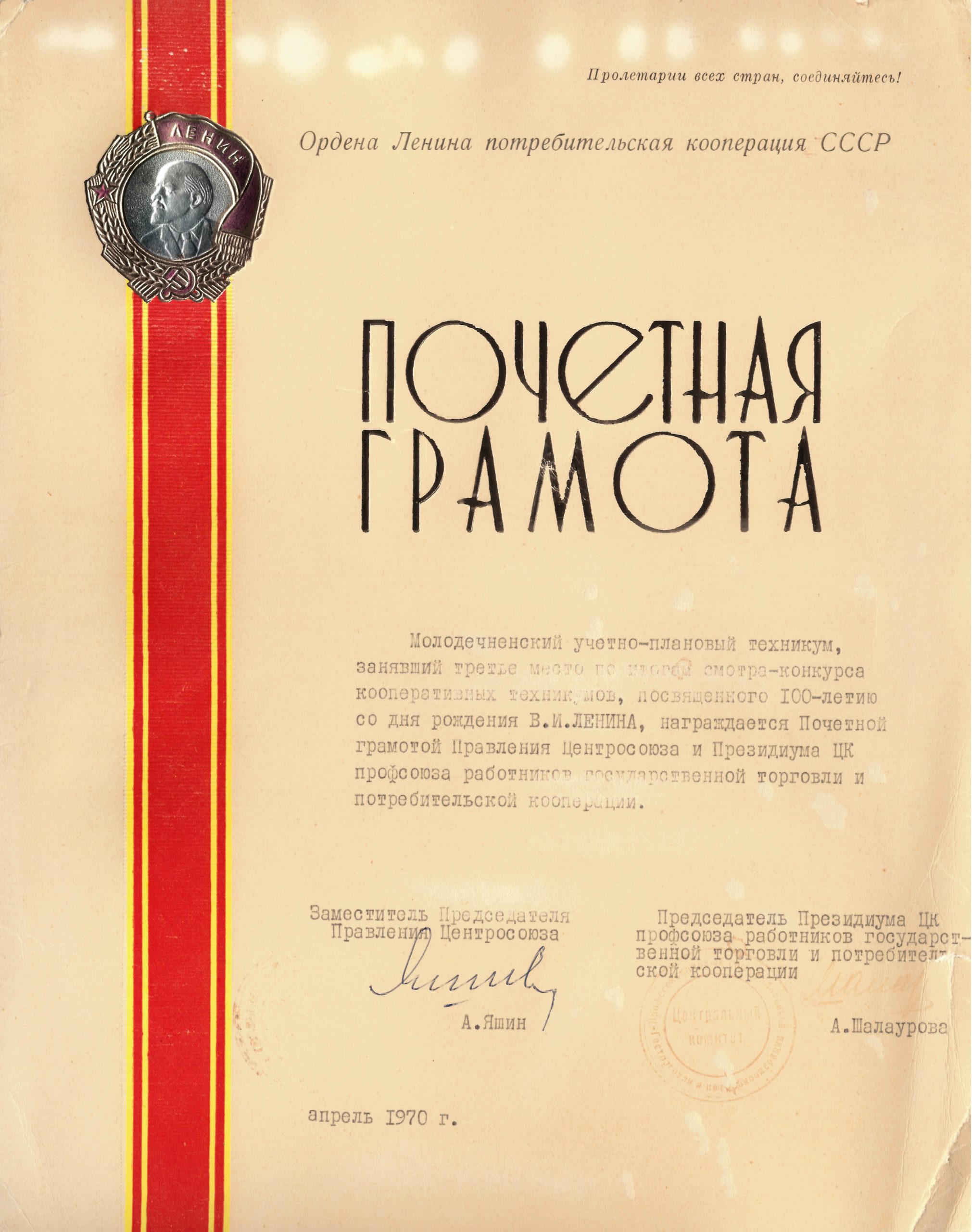 Техникум награжден Почетной грамотой Правления Центросоюза и Президиума ЦК профсоюза работников государственной торговли и потребительской кооперации за третье место по итогам смотра-конкурса кооперативных техникумов.