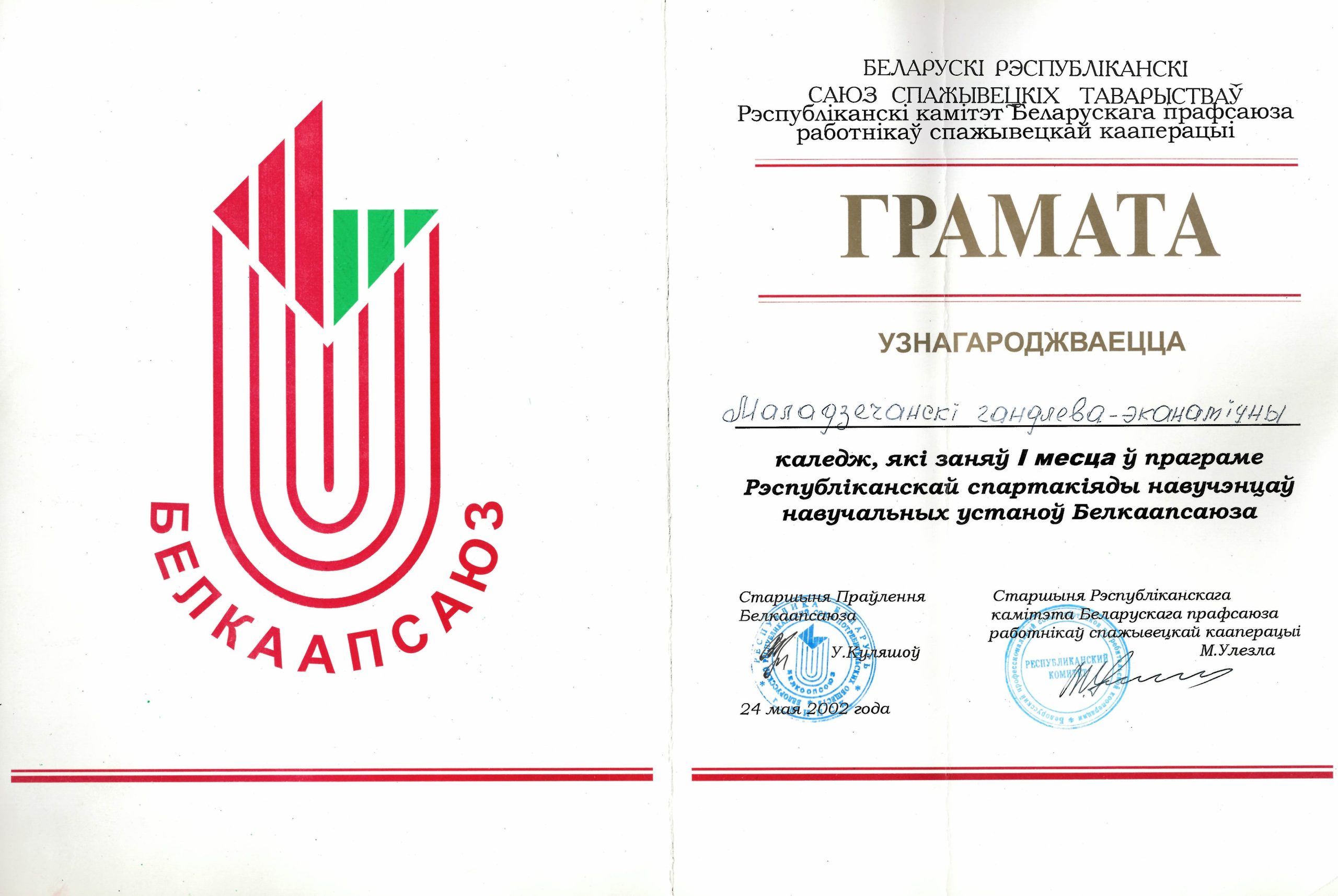 Коллектив колледжа награжден Почетным знаком Белкоопсоюза в номинации «За высокие достижения в подготовке кадров». Дипломом Правления Белкоопсоюза и БРК профсоюзов награждена команда колледжа, занявшая I место в V Республиканской спартакиаде студентов и учащихся учреждений образования потребительской кооперации.