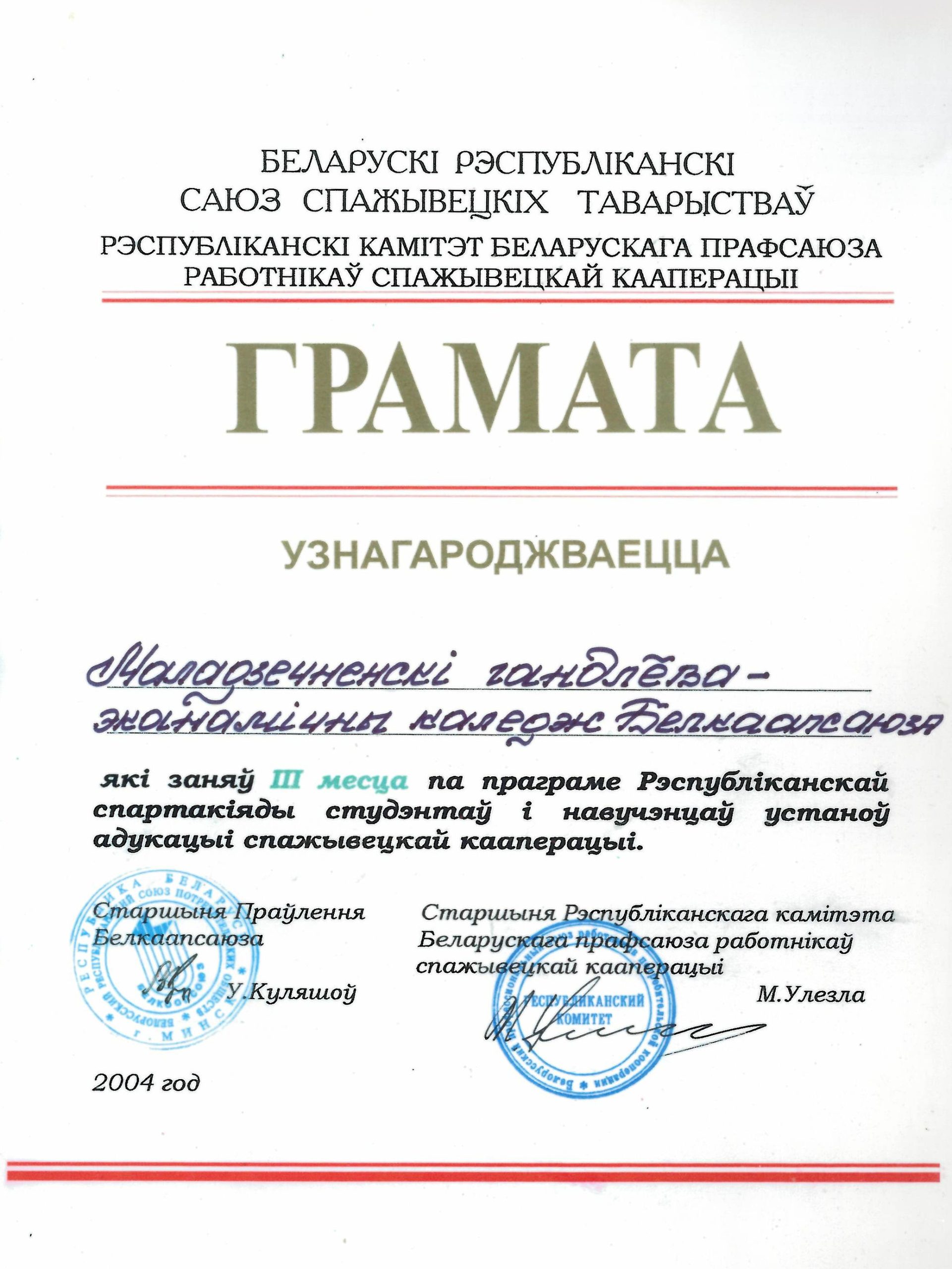 Дипломом I степени Белкоопсоюза и БРК профсоюзов потребительской кооперации награжден коллектив колледжа–победитель VI Республиканского смотра-конкурса художественной самодеятельности студентов и учащихся учреждений образования потребительской кооперации. Дипломом Правления Белкоопсоюза и БРК профсоюзов награждена команда колледжа, занявшая II место в VII спартакиаде студентов и учащихся учреждений образования потребительской кооперации. Дипломом РИПО награжден педагогический коллектив за участие в XI республиканской выставке научно-методической литературы и педагогического опыта.