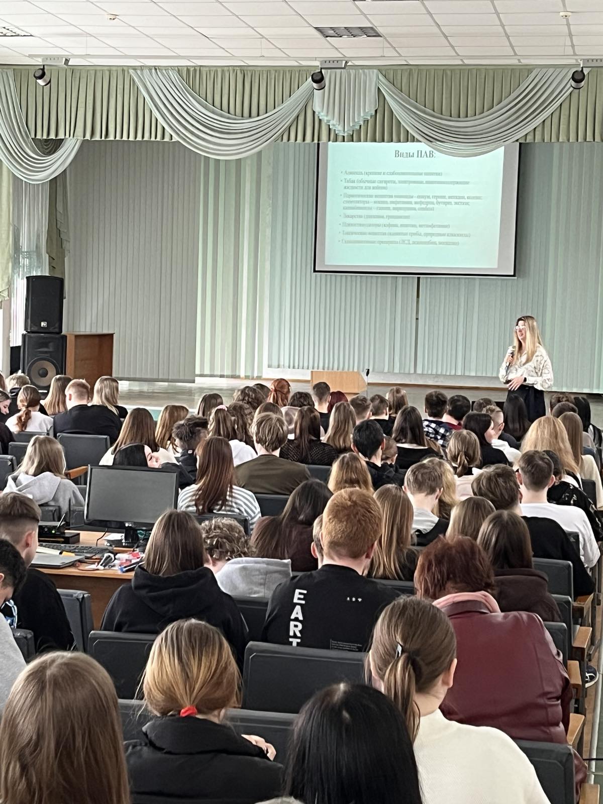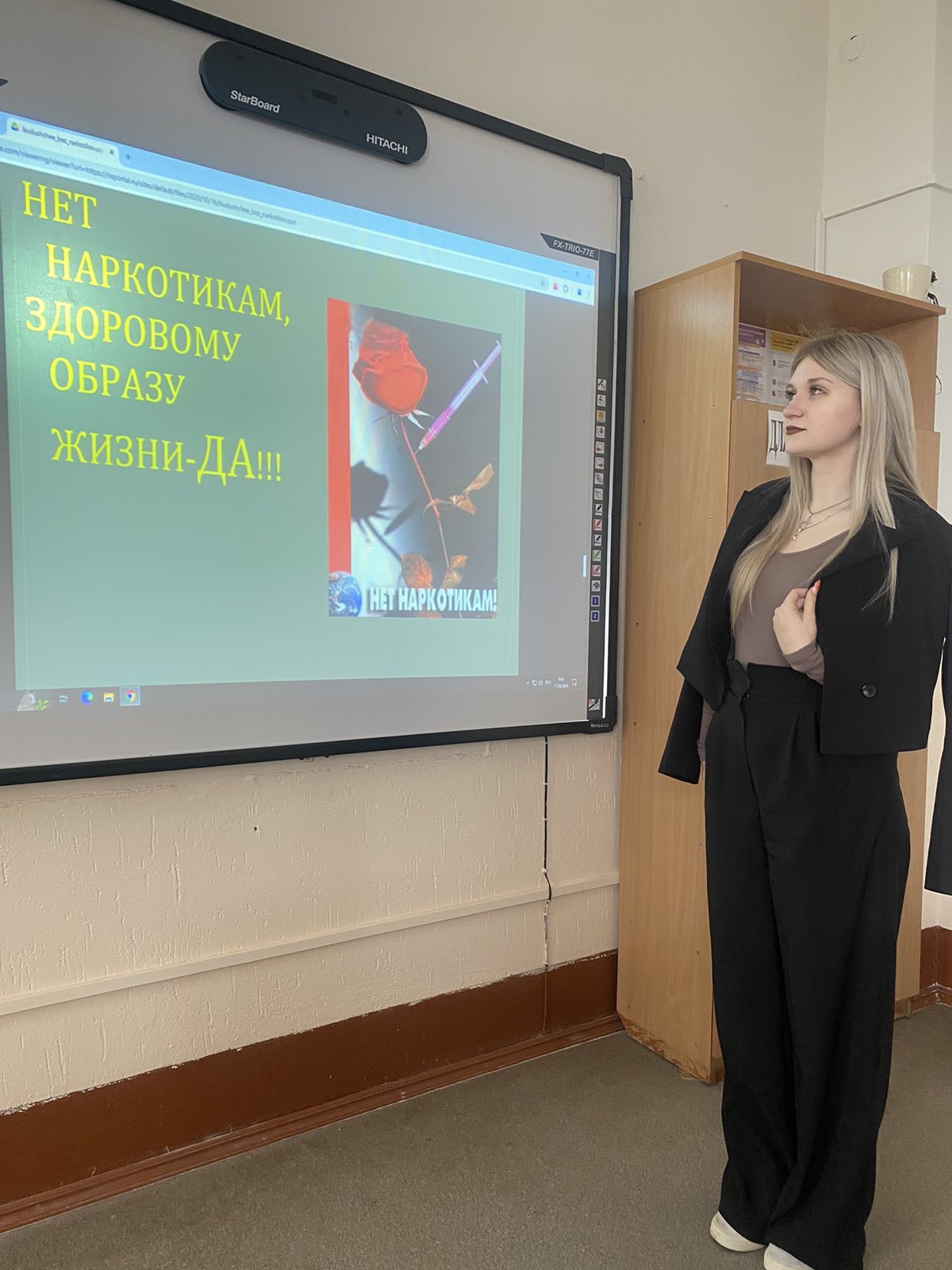 В завершении недели была организована встреча с врачом- наркологом Чуприк Екатериной Ивановной по профилактике употребления психоактивных и наркотических веществ, беседа сопровождалась показом презентации “Вместе против наркотиков”. Учащиеся узнали о видах наркотиков, об изменениях в организме человека , употребляющего наркотики, о социальных и правовых последствиях употребления ПАВ.