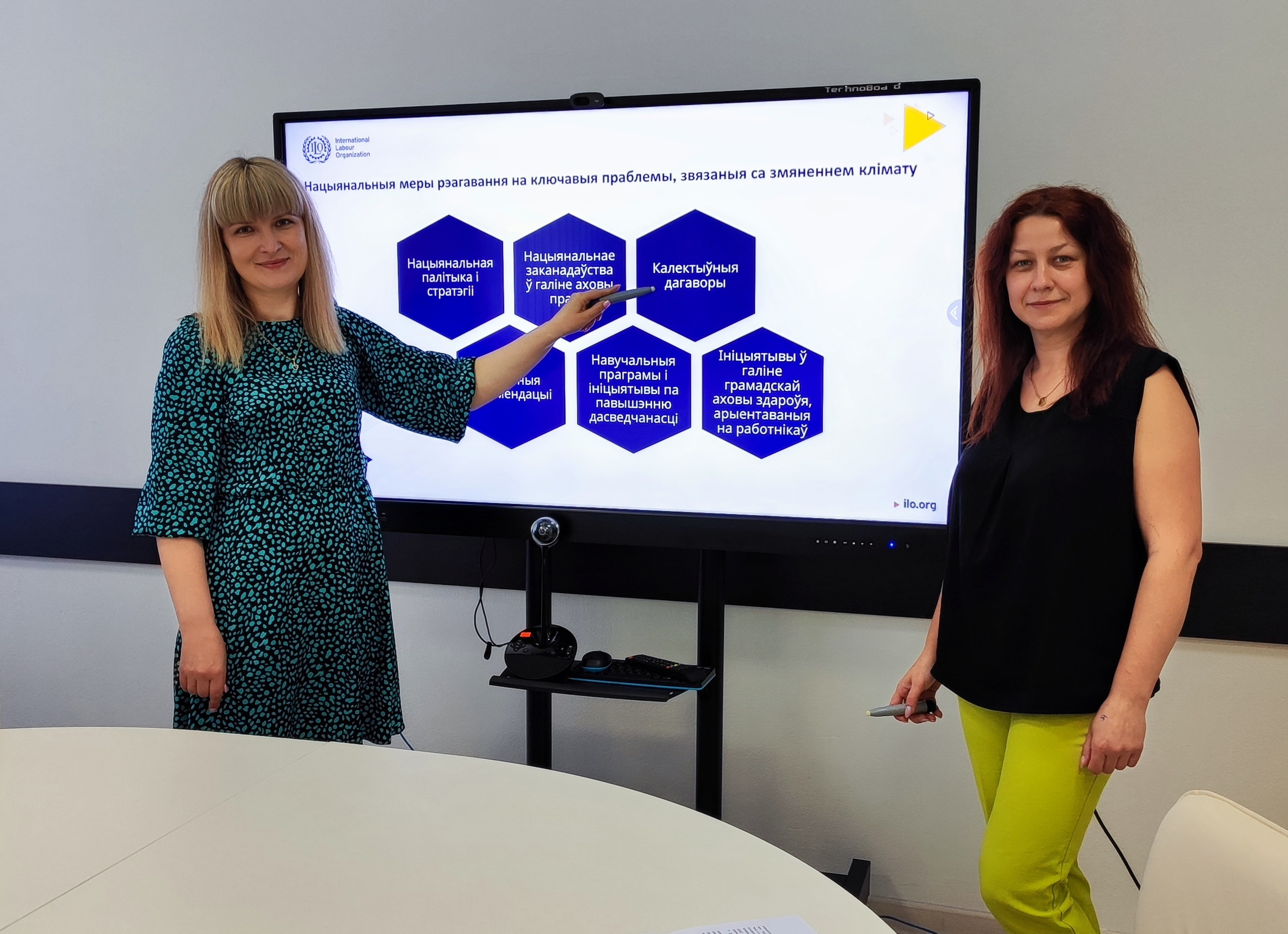 Лидеры профсоюзной организации учащихся Гоич Ирина Валерьевна и профсоюзной организации сотрудников Фалькович Ольга Тадеушевна рассказали важные данные о влиянии изменения климата на охрану труда, чтобы привлечь внимание к глобальным угрозам здоровью, с которыми в настоящее время сталкиваются работники, изложили основные права и обязанности по соблюдению охраны труда в учреждении, определили принципы безопасности труда.