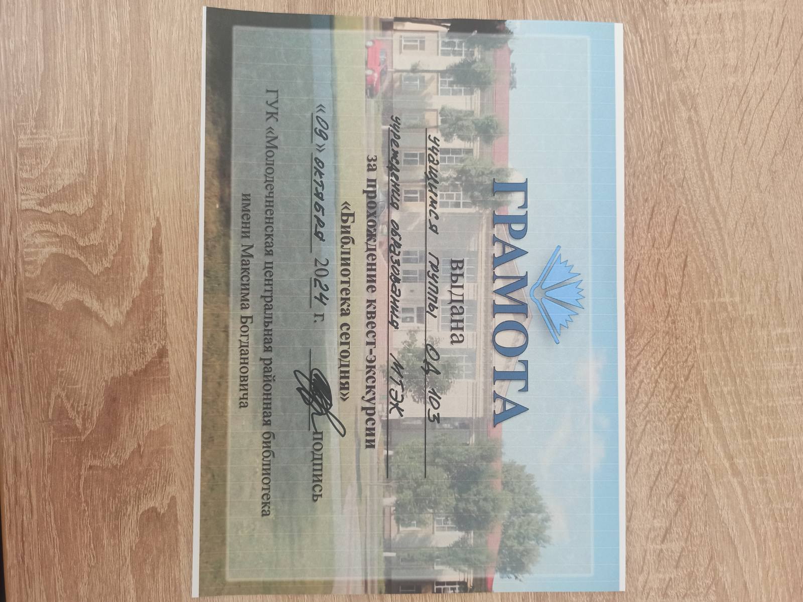 9 октября учащиеся группы ОД103 посетили центральную районную библиотеку им. М. Богдановича. Учащимся была предложена квест-экскурсия “Библиотека сегодня”, в ходе которой они ознакомились с основными залами и отделами библиотеки, а также, отгадав загадки и головоломки, сложили из отдельных пазлов логотип библиотеки.