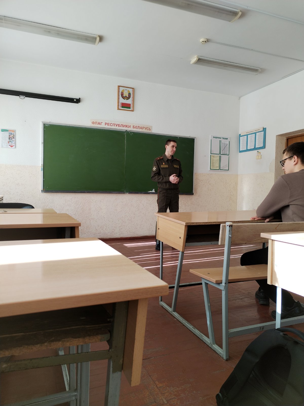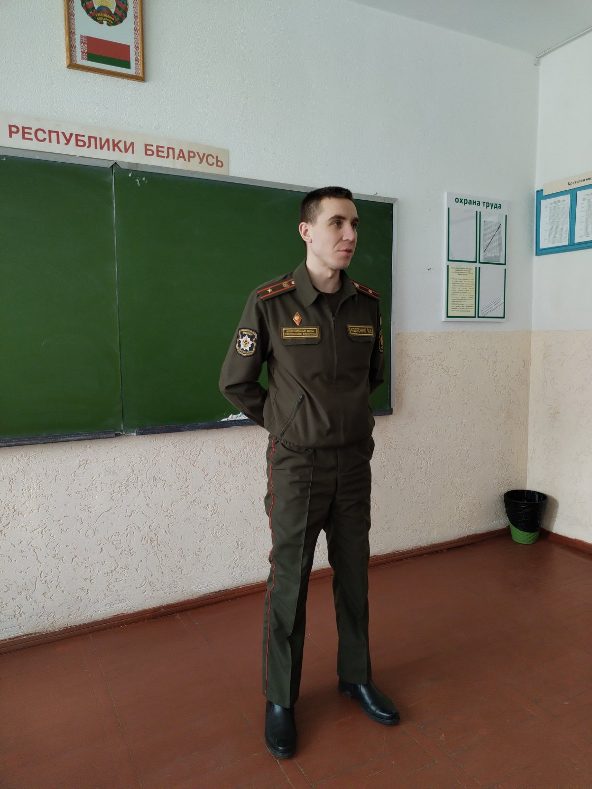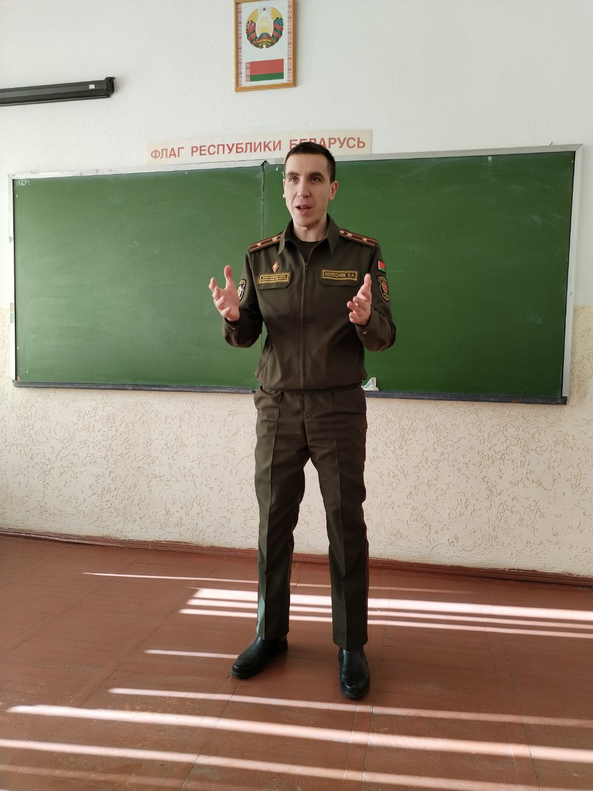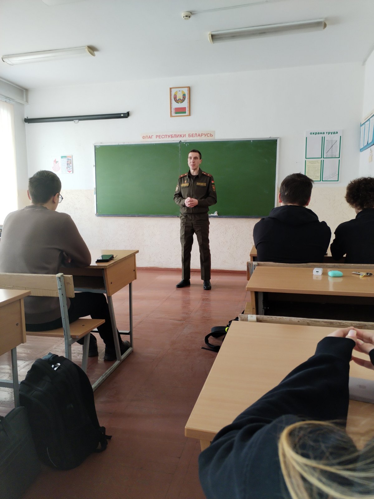 Спикером выступил начальник отдела призыва на срочную военную службу военного комиссариата Воложинского и Молодечненского районов Колесник О. Н. Выступающий рассказал о своём намерении и желании стать военным, пройденных этапах в своём профессиональном развитии, довёл учащимся информацию о правилах и условиях призыва и прохождения срочной военной службы, службы по контракту и условия поступления в высшие учебные заведения Министерства обороны Республики Беларусь, преимущества службы в Вооружённых силах. Ребята активно задавали вопросы и в завершении поблагодарили Олега Николаевича за интересную и познавательную беседу.
