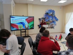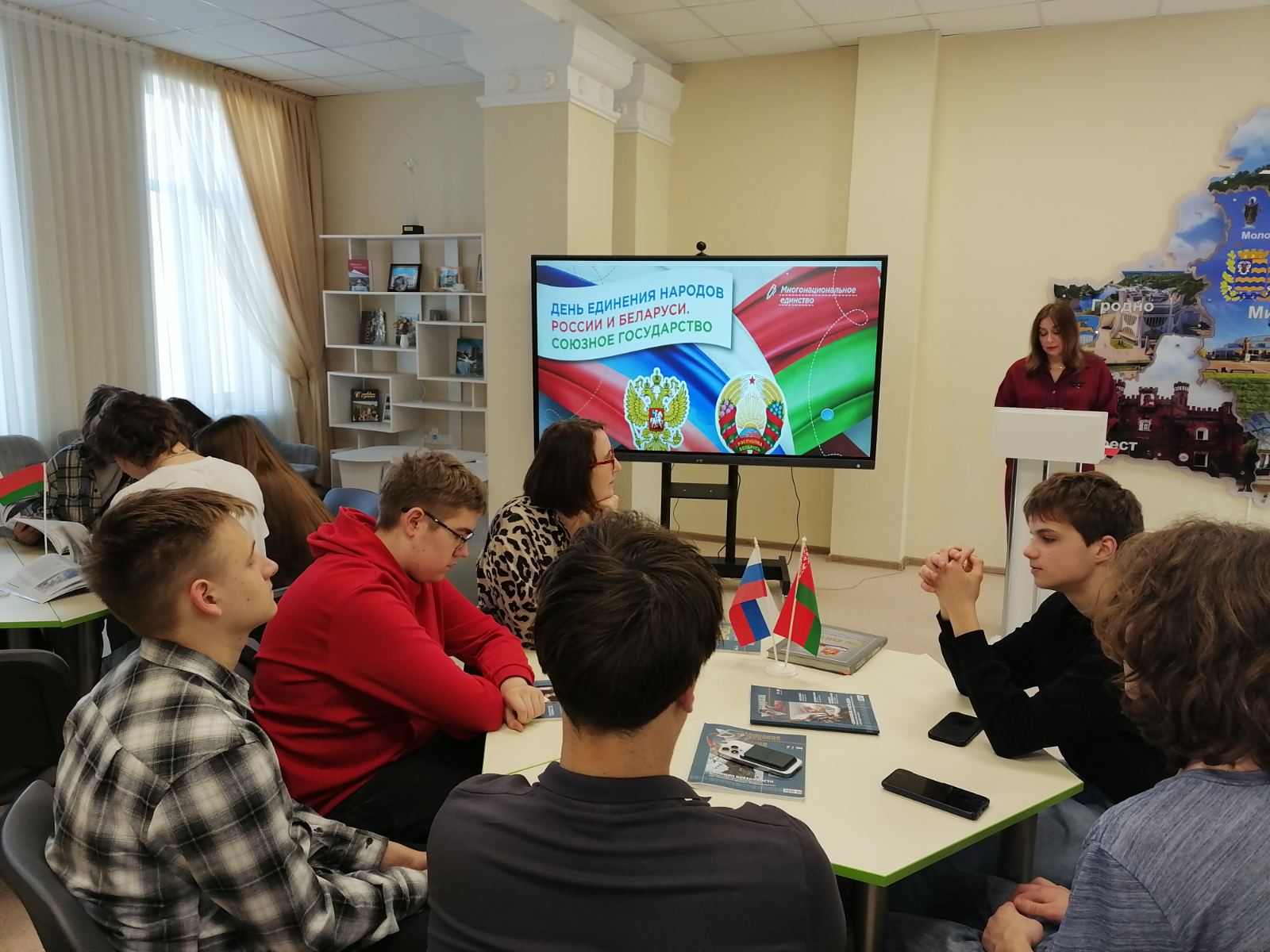 1 апреля 2026, в преддверии Дня единения народов Беларуси и России, в центральной библиотеке им. М. Богдановича прошла диалоговая площадка “История и современность содружества Беларуси и России”. В мероприятии приняла участие группа ИТ 105. Для учащихся была представлена обзорная презентация, охватывающая ключевые этапы становления и развития двухсторонних отношений. Учащиеся с большим интересом слушали о современных культурных, научных и экономических проектах, которые являются прочным фундаментом для дальнейшего укрепления братства.