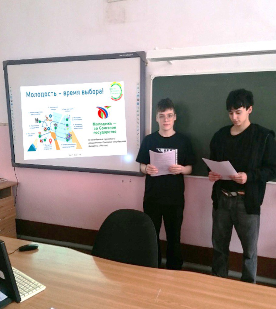 При проведении единого дня информирования в рамках информационно-образовательного проекта «Школа активного гражданина» учащиеся 1-2 курсов на первом этапе приняли участие в интерактивной викторине «Мы узнаём» и обсудили вопросы: молодежной политики Союзного государства Беларуси и России, Молодежной палаты,молодежные проекты и инициативы Союзного государства, укрепление дружеских связей, молодежного движения Союзного государства, активной жизненной позиции, инициативности, гражданской зрелости, патриотизма.