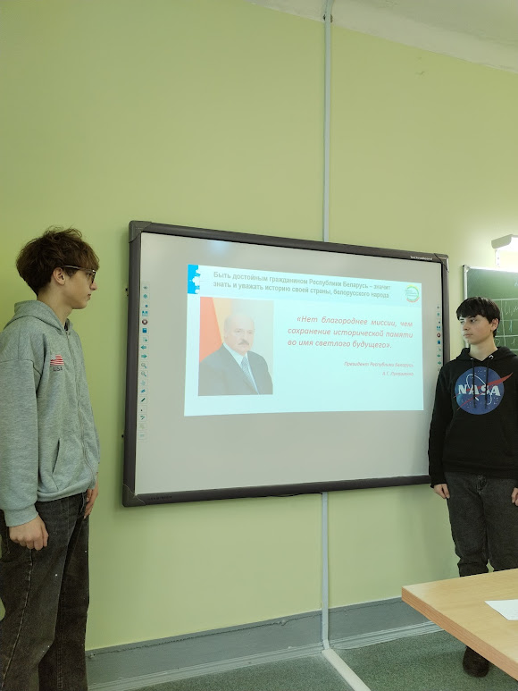 На втором этапе ШАГа «МЫ РАССУЖДАЕМ», в состоявшейся беседе обсудили с учащимися исторические этапы образования первых государств на территории современной Беларуси, создание первого национального белорусского государства – БССР, воссоединение Западной Беларуси с БССР в 1939 г., проявление массового героизма белорусского народа в годы Великой Отечественной войны, восстановление БССР после Великой Отечественной войны, образование независимого суверенного государства – Республика Беларусь, меры по формированию и сохранению исторической памяти белорусского народа, обратив особое внимание на расследование Генеральной прокуратурой Республики Беларусь уголовного дела о геноциде белорусского народа в годы Великой Отечественной войны, учреждение государственного праздника – День народного единства, восстановление и реконструкцию памятников истории и культуры, мемориальных комплексов, строительство нового здания Национального исторического музея, сюжеты фильмов исторической тематики «Черный замок», «Время вернуться», «Брестская крепость», республиканский конкурс «Открываем Беларусь, акции БРСМ по сохранению исторической памяти: «Беларусь помнит. Родные лица Победы», «Цифровая звезда», «Хатынь в моем сердце», «Цветы Великой Победы», участие студенческих строительных отрядов в реконструкции мемориального комплекса «Хатынь».